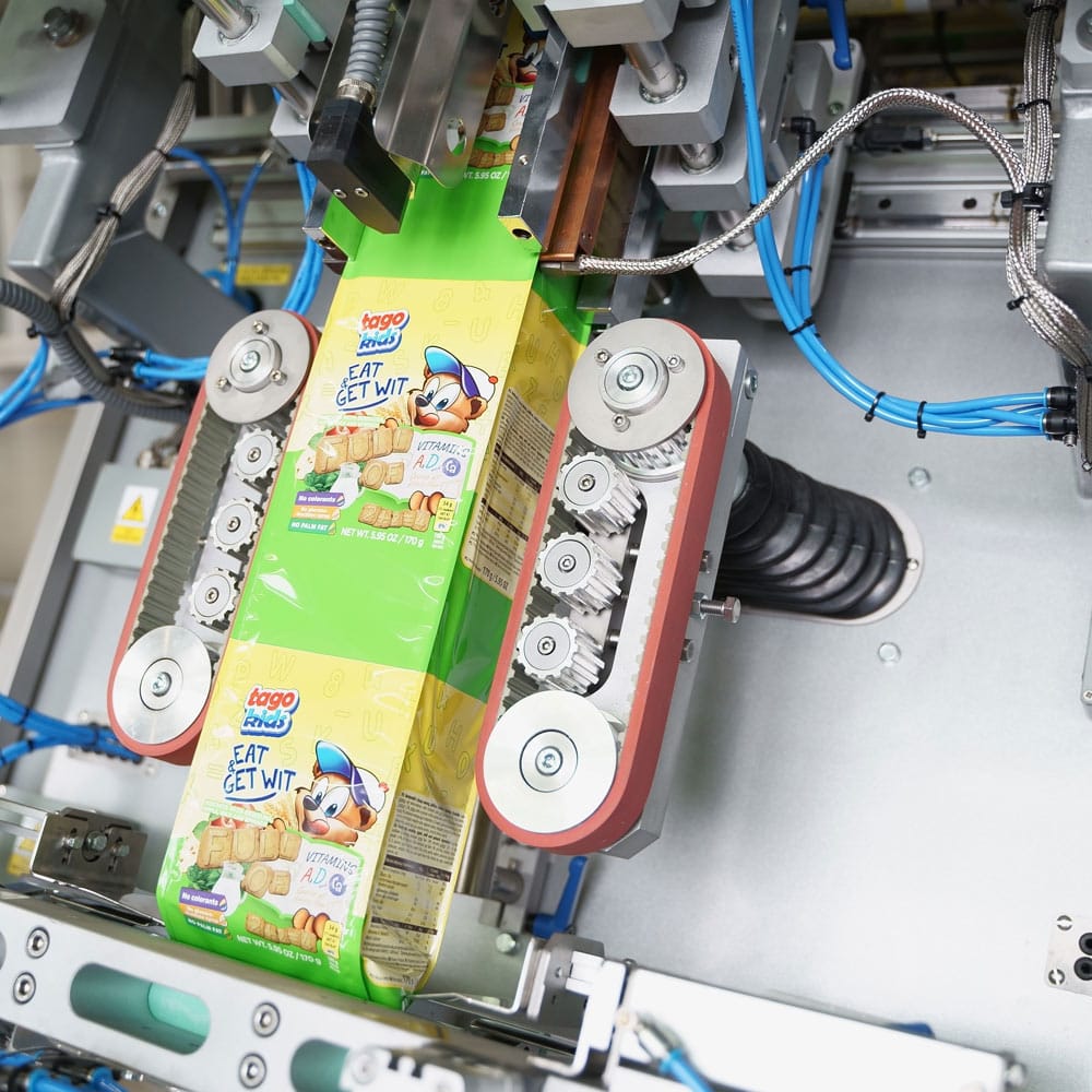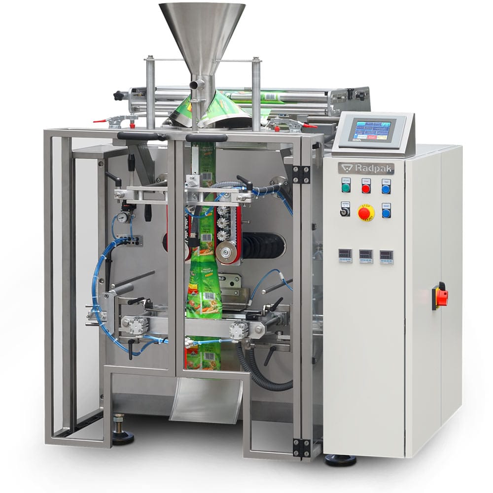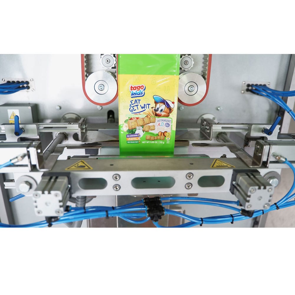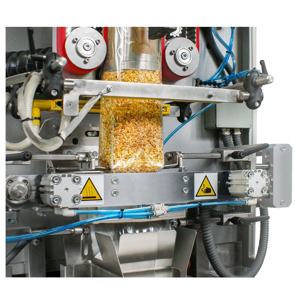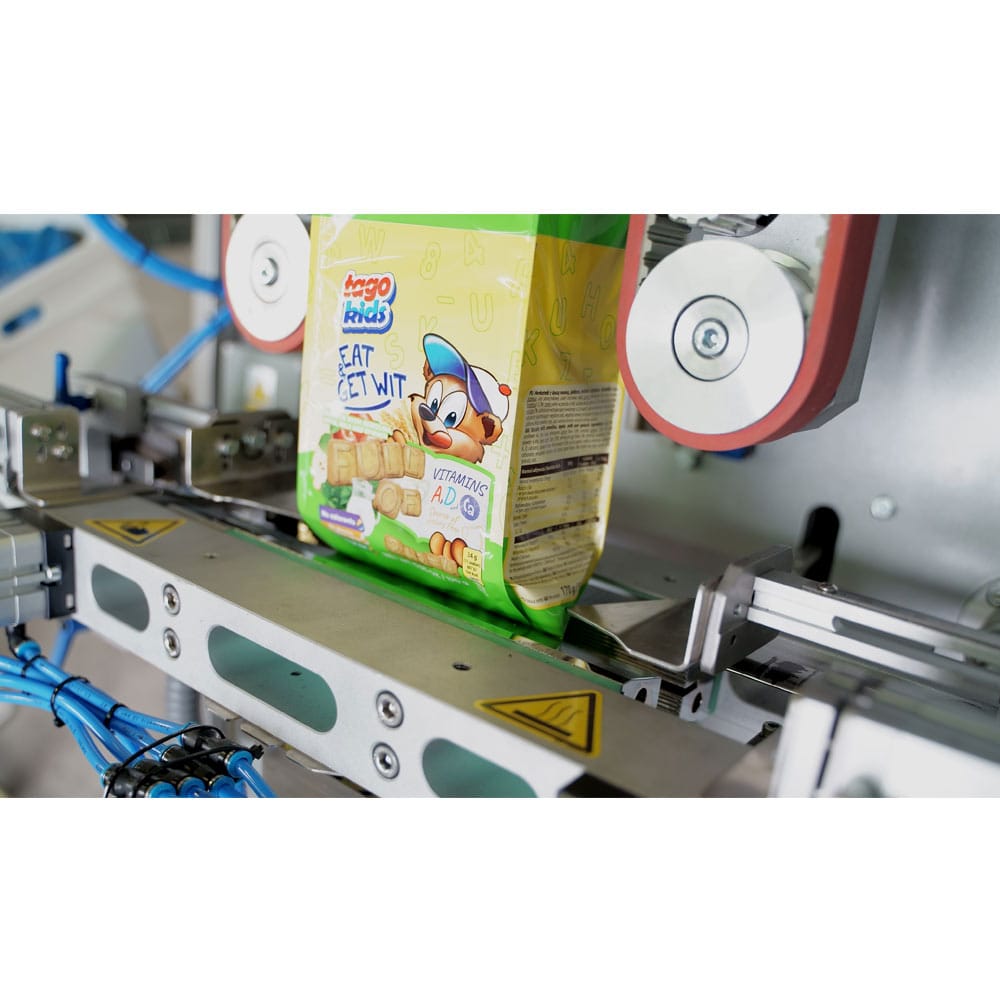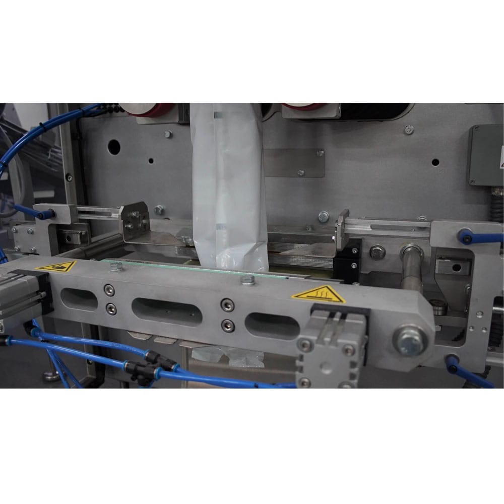 VFFS packaging machine to forming of a side gusseted pouch that has improved stability and shelf exposure. It is an ideal system for a more economic stand-up pouch solution.