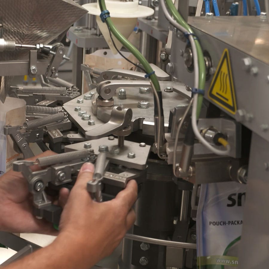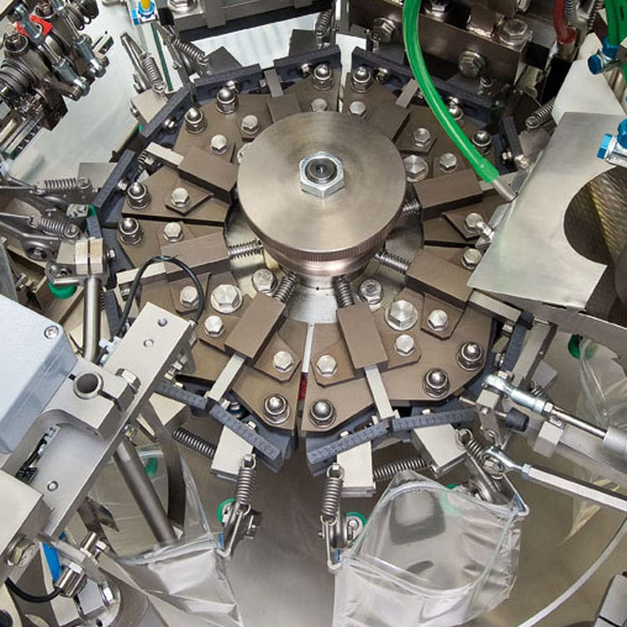 The intermittently working rotary machine produces and fills almost all types of side-seal bags from the roll.