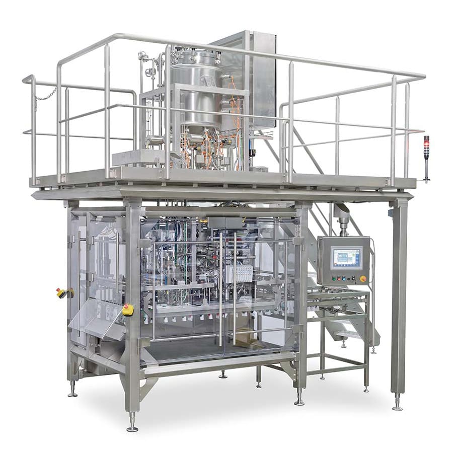 Horizontal filling and sealing machine with four linear tracks for prefabricated flat or stand-up pouches with center spout. By filling through the spout, a higher filling level is achieved in the bag.